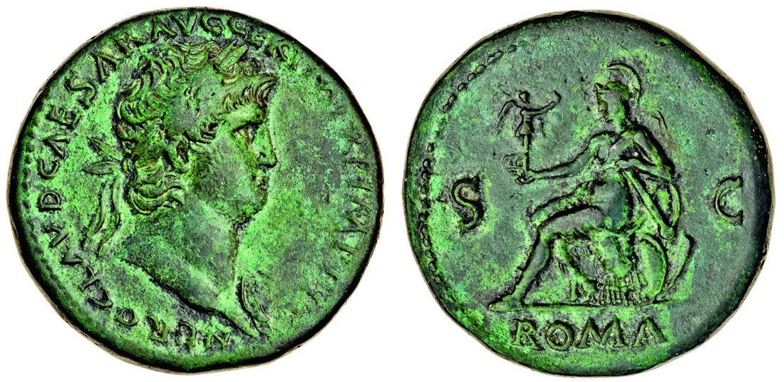 Nero (AD 54-68), AE Sestertius, Rome, laureate bust right, aegis at shoulder, rev. roma, s-c, Roma seated left on cuirass, holding Victory before and parazonium at her side, shields on ground (RIC 273; BMC 173; WCN145), attractive green-brown patina, good very fine