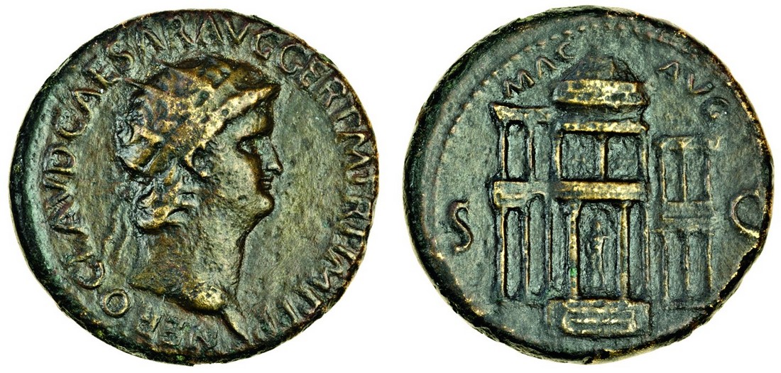 Nero (AD 54-68), AE Dupondius, Rome 64, radiate head left, rev., mac avg, s-c, facade of the Macellum Magnum (RIC 184), about very fine