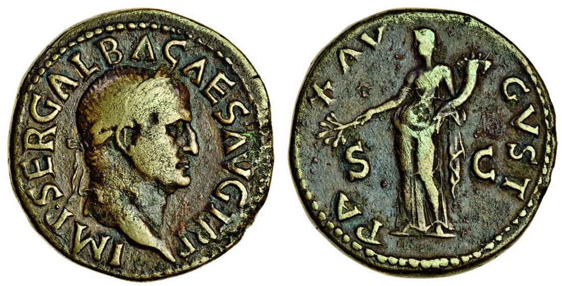 Galba (AD April 68-Jan. 69), AE Dupondius, laureate head right, rev. pax avgvst, s-c, Pax standing facing, head left, holding branch and cornucopia (RIC 370; BMC 124; RCV 2129 var.), brown tone, almost very fine, scarce