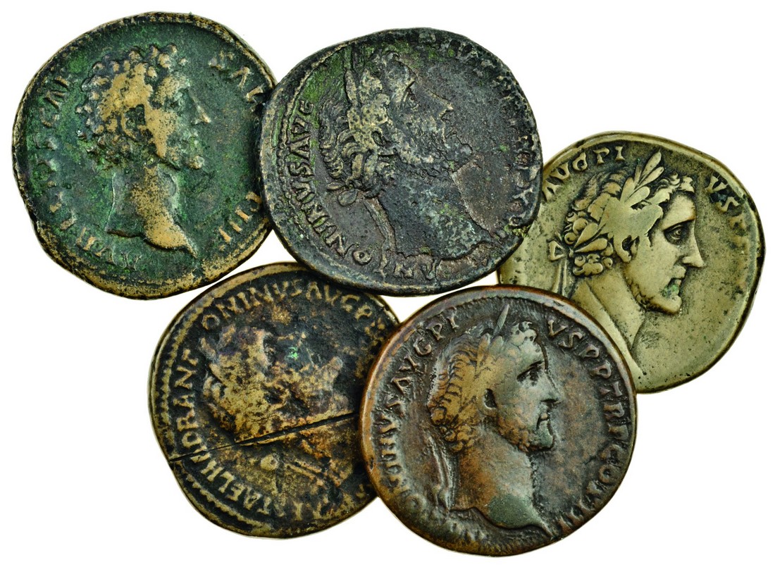 Antoninus Pius (138-61), AE Sestertii (4), laureate head right, revs. Libertas, Salus feeding snake rising from altar (2), Annona seated left, Marcus Aurelius, as Caesar, AE Sestertius, bare head right, rev. Pietas standing left, right hand on head of child on left, good fine to almost very fine (5)