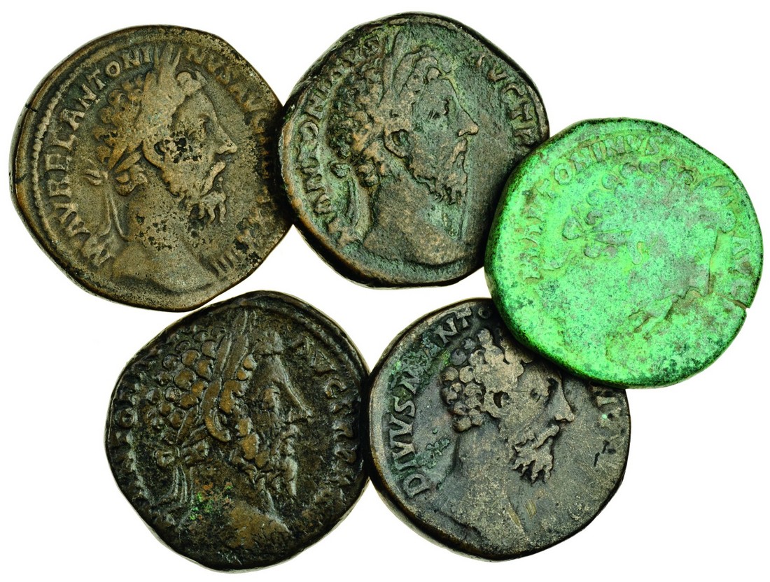 Marcus Aurelius (161-80), AE Sestertii (5), laureate head right, revs. Roma seated left (2), Virtus seated right, Victory standing right inscribing vic/ger on shield set on palm, Divus (posthumous) type, bare head right, rev. funeral pyre, good fine to almost very fine (5)