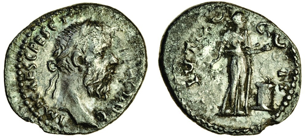 Pescennius Niger (spring AD 193- spring/summer AD 194), AR Denarius, 3.35g, Antioch or Caesarea, laureate head right, imp caes c pesc ni[ger ivst] avg, rev. [sa]lvti [av]gvsti, Salus standing right, feeding snake held in her arms, altar on right (RIC 77; BMC p.80, ‡ note; RSC 68), almost very fine, rare