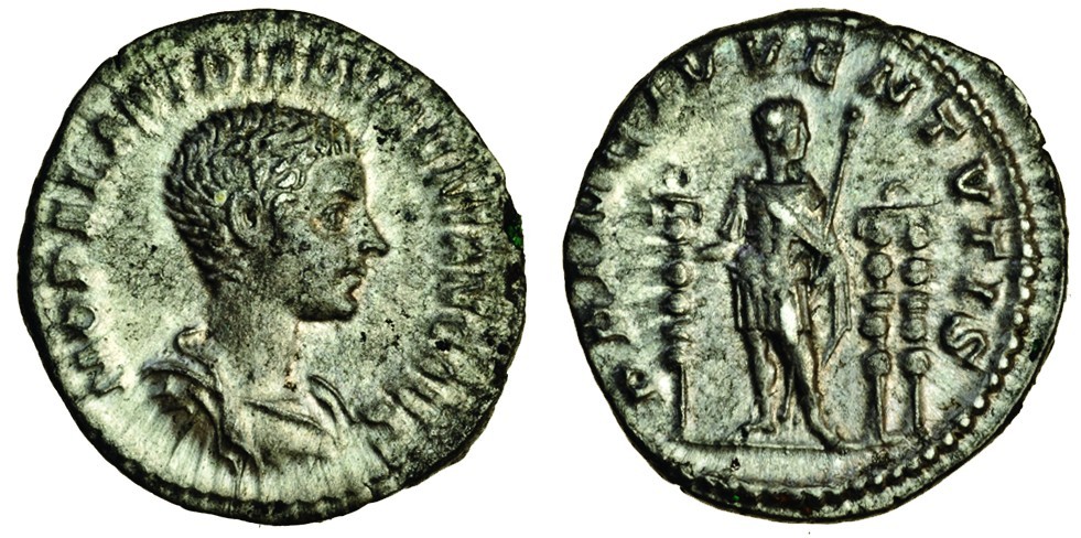 Diadumenian, son of Macrinus, AR Denarius, as Caesar, bare-headed, draped and cuirassed bust right, rev. princ ivventvtis, Diadumenian standing left, holding standard and sceptre, two standards behind (RIC 102; RSC 3), toned, very fine