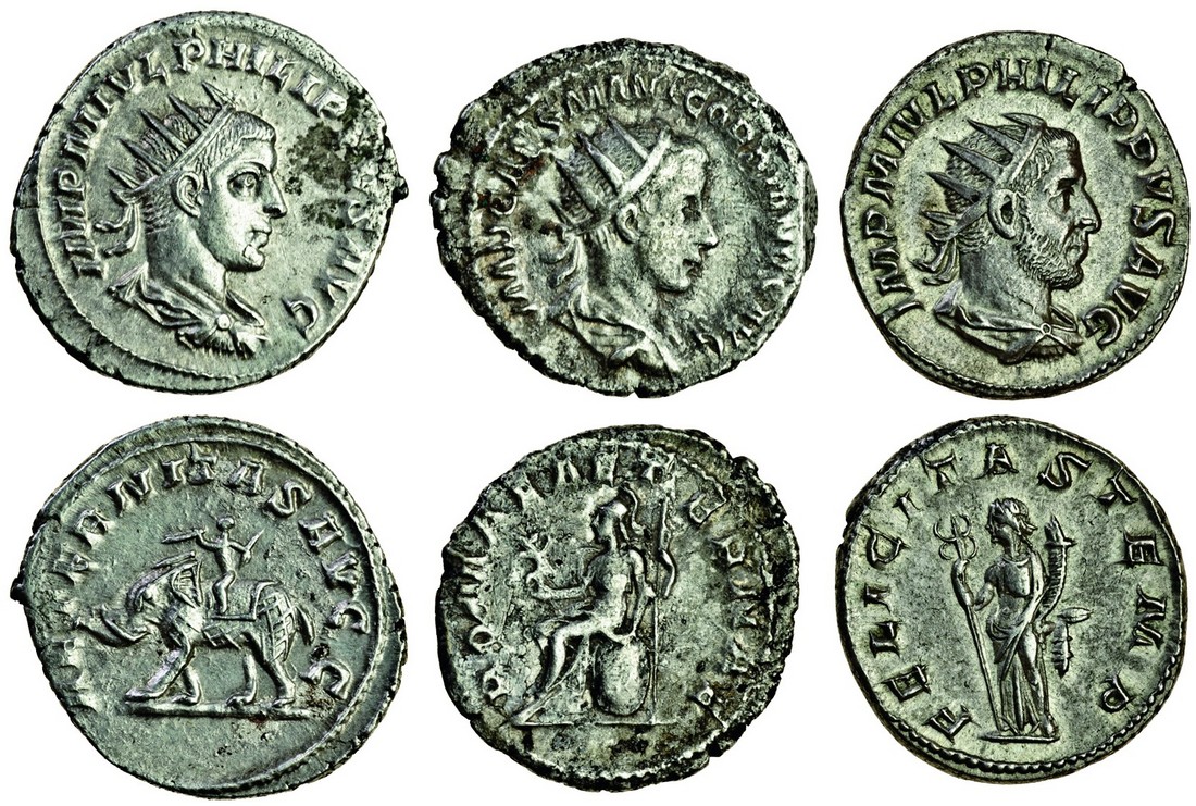 Philip I (AD 244-249), AR Antoninianus, radiate, draped and cuirassed bust right, rev. aeternitas avgg, elephant walking left, ridden by mahout (RIC 58; RSC 17), area of erosion before bust, extremely fine, another, similar bust, rev. felicatas temp, Felicitas standing left, holding long caduceus and cornucopia (RIC 31; RSC 43), almost extremely fine, Gordian III Antoninianus, radiate, draped bust right, rev. romae aeternae, Roma seated left (RIC 70; RSC 314), some erosion, almost very fine (3)