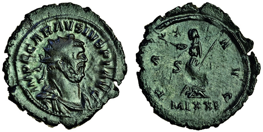 Carausius (286-93), AE Antoninianus, London, radiate, draped and cuirassed bust right, rev. pax avg, Pax standing left, holding branch and sceptre, s before, mlxxi in ex. (RIC 475), a very large flan, smooth green patina, very fine