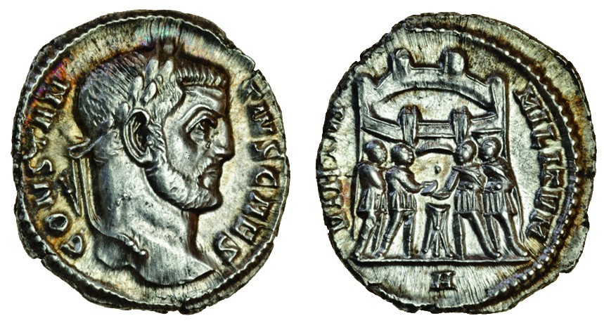 Constantius I (305-06), as Caesar, AR Argenteus, Rome, 295-7, laureate head right, rev. virtvs militvm, the four tetrarchs sacrificing over altar before gateway of six-turreted military camp, a in ex. (RCV 13959; RSC 314†b; RIC 42a), toning, extremely fine