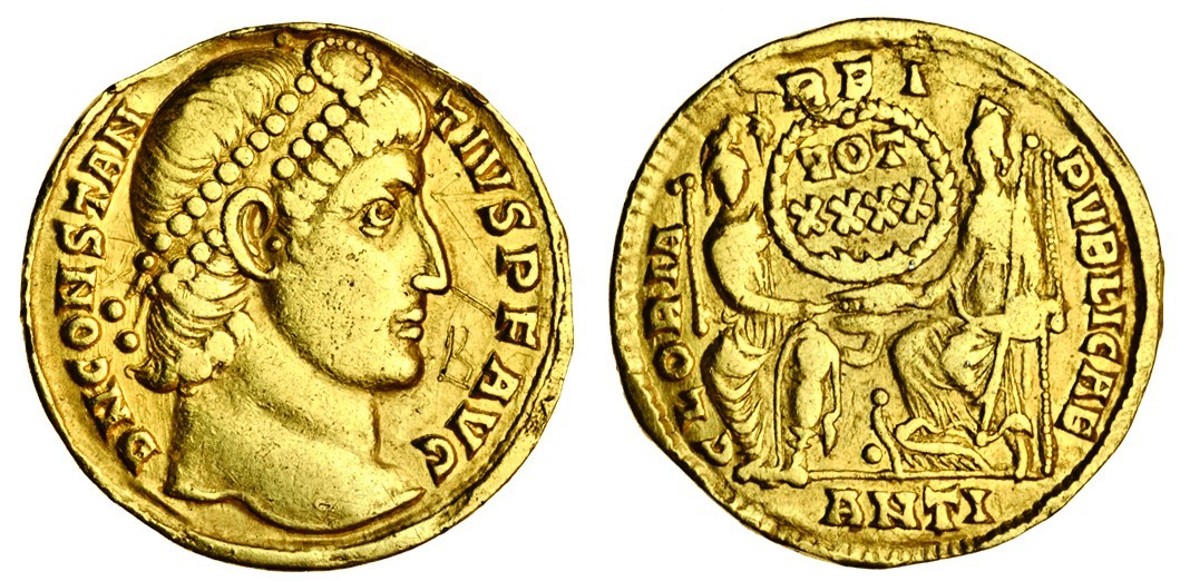 (x) Constantius II (337-61), AV Solidus, 4.02g, Antioch, pearl diademed head right, d n constan-tivs p f avg, rev. gloria-rei-pvblicae, Roma and Constaninopolis seated holding between them a wreath inscibed vot xxxx, in ex. anti (RIC 172), edge marks, good fine, scarce
