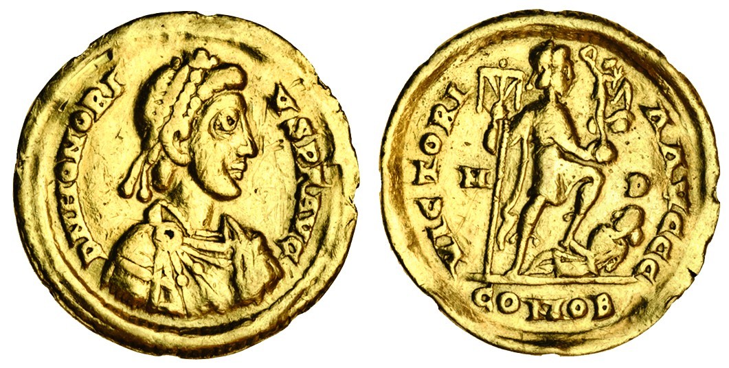 (x) Honorius (393-423), AV Solidus 4.28g, Milan, diademed bust right, rev. victori-a avggg, Honorius standing right holding standard, foot on captive, m d in field, in ex. comob (RIC 35c), from a mount, fine