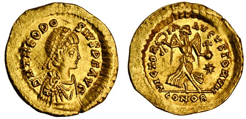 Theodosius II (402-50), AV Tremissis, 1.47g, Constantinople, pearl-diademed, draped and cuirassed bust right, rev. victoria avgvstorvm, Victory walking right, head left, holding wreath and cross on globe, star on right, conob in ex. (RIC 213), extremely fine