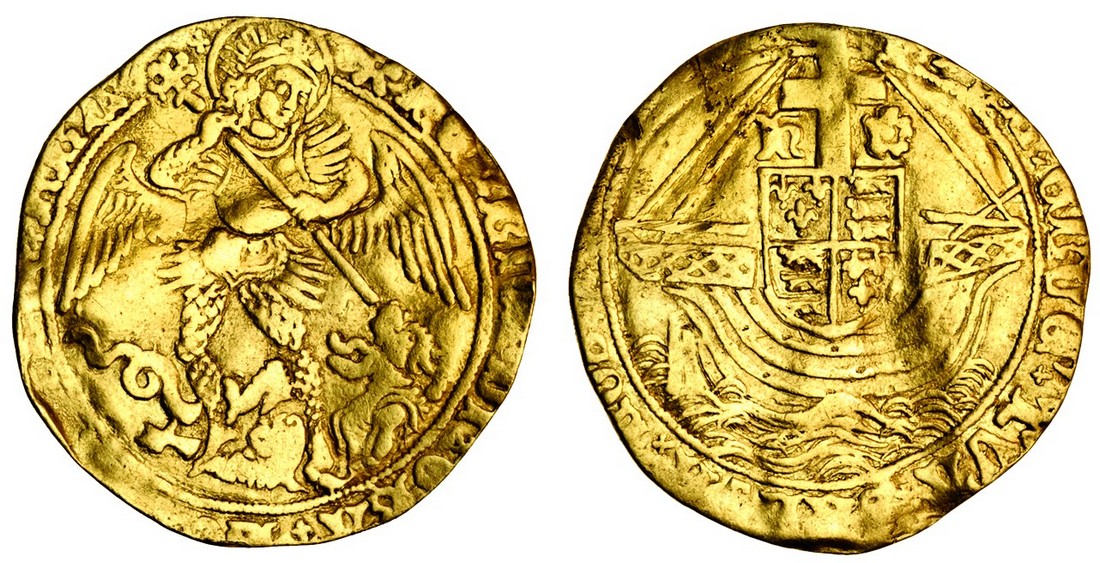 Henry VII (1485-1509), Angel, 4.66g, type III, m.m. pansey, St Michael spearing dragon, rev. shield within ship, cross above dividing h and a rose (N.1696; S.2183), crease, slipped. otherwise fine