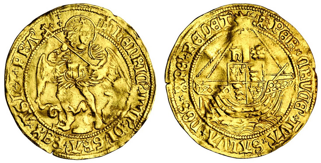 Henry VIII (1509-47), first coinage, 1509-26, Angel, 5.16g, m.m. castle, St Michael spearing dragon, rev. shield within ship cross above dividing h and a rose (cf Schneider 557-58; N.1760; S.2265), creasing, otherwise very fine