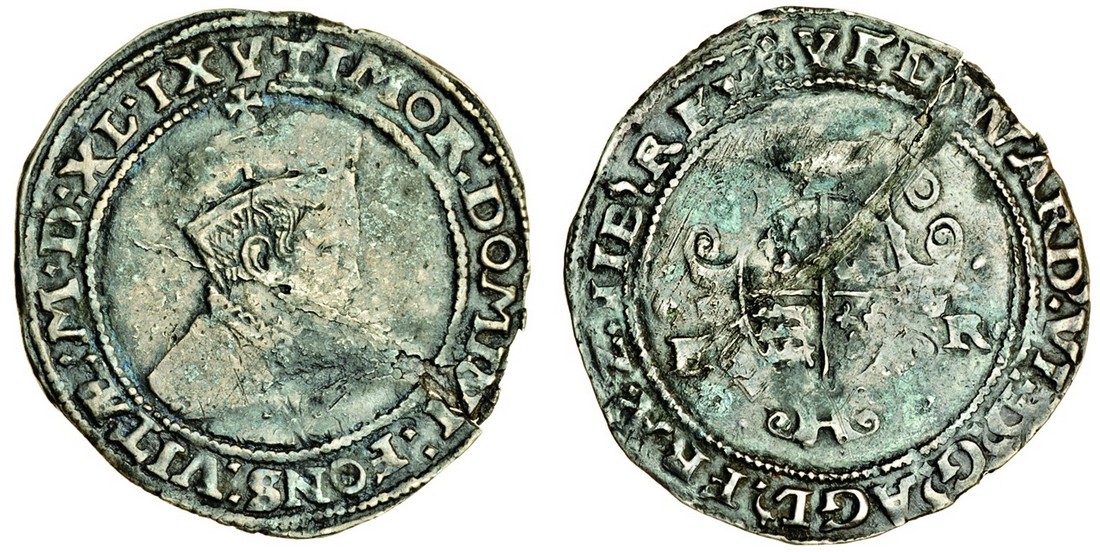 Edward VI (1547-53), second period, January 1549-April 1550, Shilling, 3.59g, mdxlix, Southwark, m.m. y, crowned bust right, rev garnished shield dividing e r (N.1818/2; S.2565A), creased, flan spilt, otherwise good fine