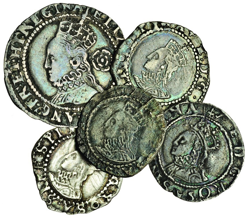 Elizabeth I (1558-1603), third and fourth issues, 1561-77, Penny, 0.54g, m.m. coronet, nearly very fine, fifth issue, 1577-82 (2), Threepence, m.m. sword, 1582 (N.1998; S.2573), nearly very fine, 0.58g, Penny, m.m. Greek cross (N.2001; S.2575), good fine, sixth issue, 1582-1600, Penny, 0.32g, m.m crescent (N.2017; S.2580), fine, seventh issue, 1600-02, Penny, 0.32g, m.m. 2 (N.2017; S.2587), good fine (5)