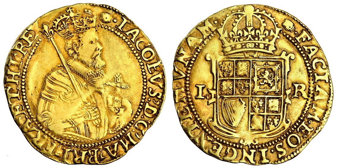 James I (1603-25), second coinage, 1604-19, Unite, 9.80g. m.m. tun, fifth crowned, armoured bust right, rev. crowned garnished shield (cf Schneider 29-30; N.2085; S.2620), slightly creased, nearly very fine