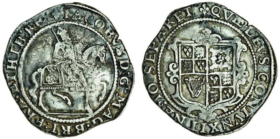 James I (1603-25), third coinage, 1619-25, Halfcrown, 14.70g, m.m. lis, king, crowned, riding right, rev. garnished shield (N.2122; S.2666), good fine