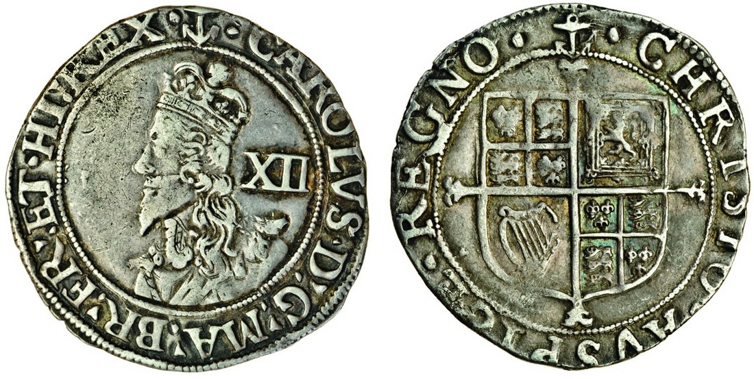 Charles I (1625-49), Shilling, 5.69g, group E, 4.1, 5.69g, m.m. upright anchor, crowned bust left, rev. shield over cross moline (Brooker 517-19; N.2229; S.2795), about very fine