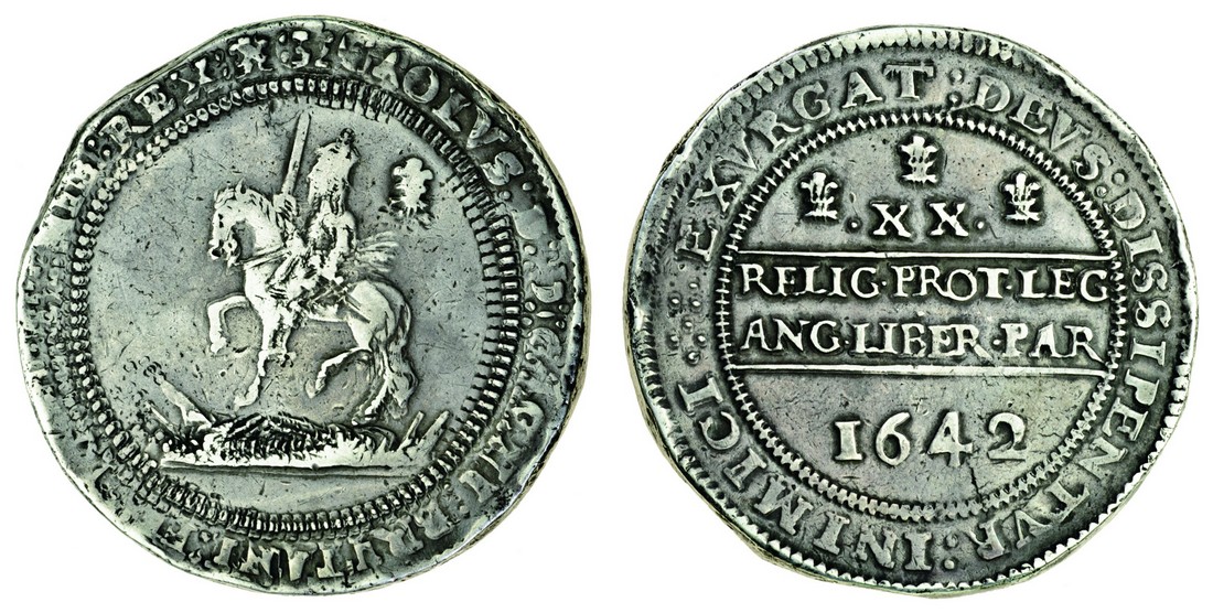 Charles I (1625-49), Civil War coinages, Oxford, 1642-46, Pound, 119.08g, 1642, m.m. plume /-, King, crowned and holding sword, riding left over arms, no cannon, Oxford plume behind, rev. Declaration in two lines, value and three Oxford plumes above, date below (Brooker 861 - same reverse die; N.2399; S.2939), obverse double struck, reverse better, fine / nearly very fine