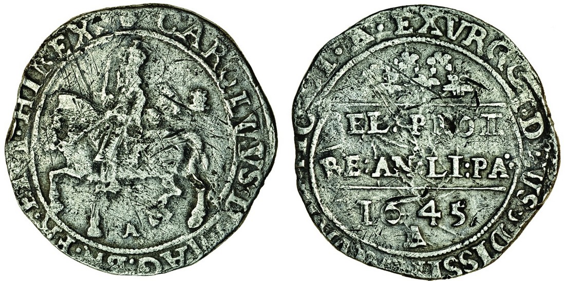 Charles I (1625-49), Civil War coinages, Ashby de La Zouche, 1645, Halfcrown, 1645, m.m. A over BR / A, king, crowned riding left, plume behind, a below, rev. Declaration in two lines, three plumes above, date and a below (Brooker 1118 -1119, same obverse dies; N.2512; S.3028), a field find, scuffed, very good /about fine, very rare