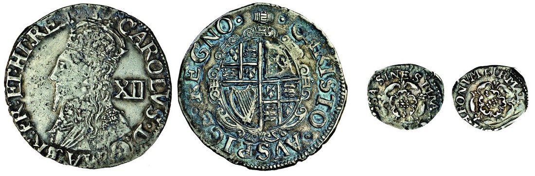 Charles I (1625-49) (2), Shilling, 6.01g, group D, type 3a, m.m. tun, crowned bust left, rev garnished shield (Brooker 509-510; N.225; S.2791), nearly very fine, Penny, 0.44g, rose each side (N.2262; S.2838), irregular flan, very fine (2)