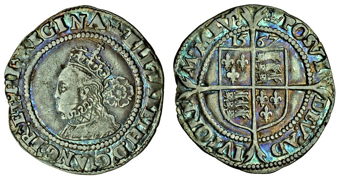 Elizabeth I (1558-1603), third and fourth issues, 1561-77, Sixpence, 3.02g, 1567, m.m. coronet, crowned bust left, ir for fr, rev. shield over long cross fourchée (N.1997; S.2562), toned, nearly very fine / very fine