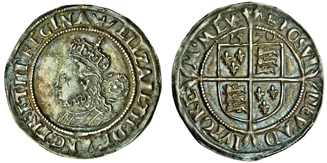 Elizabeth I (1558-1603), third and fourth issues, 1561-77, Sixpence, 3.00g, 1570, m.m. coronet, crowned bust left, rev. shield over long cross fourchée (N.1997; S.2562), toned, about extremely fine / good very fine
