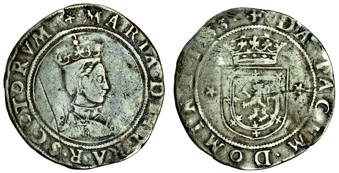 Mary (1542-67), first period, before marriage to Francis, 1542-58, Testoon, 4.60g, 1553, crowned bust right, rev. crowned shield, cinquefoil each side (Burns, fig.780; S.5401), scratch behind bust, fine, very rare
