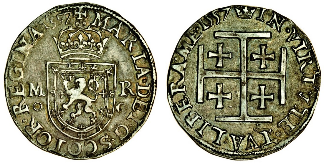 Mary (1542-67), first period, before marriage to Francis, 1542-58, Testoon, 6.01g, type IIIa, 1557, crowned shield dividing m r, each with an annulet below, rev. cross potent, cross in each angle (S.5404), reverse a little off-centre, even light grey tone, very fine