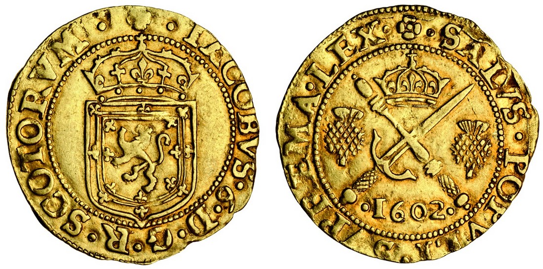 James VI (1567-1625), eighth coinage, Sword and Sceptre piece, 4.95g, 1602, crowned shield, rev. sceptre over sword, a thistle each side, crown above, date below (S.5460), very fine