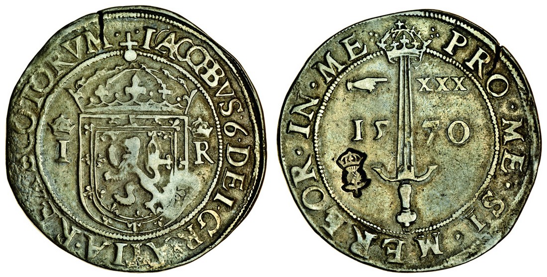James VI (1567-1625), first coinage, 1567-71, Ryal, 30.17g, crowned shield dividing crowned i r, rev. upright sword, dividing date, tipped with a crown, below, hand on left and xxx on right, 1578 revaluation countermark to left of sword hilt (S.5472), even tone, nearly very fine