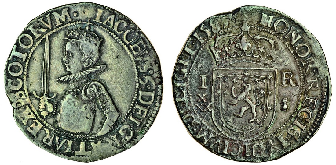 James VI (1567-1625), fourth coinage, Thirty Shillings, 22.43g, 1585, half-length crowned and armoured bust of young king left, rev. crowned shield dividing i r, below xxx -s (S.5487), pleasing detail of bust, reverse slightly off-centre, good very fine / very fine, rare