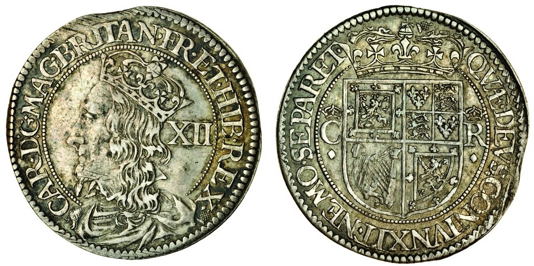 Charles I (1625-49), third coinage, 1637-42, intermediate issue, Twelve Shillings, 5.81g, crowned bust left, rev. crowned shield dividing crowned c r, small thistle above crown (S.5559), light adjustment marks on obverse, very fine