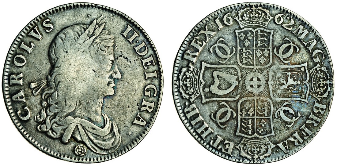 Charles II (1660-85), Crown, 1662, first laureate, draped bust right, rose below, rev. four crowned shields cruciform (ESC 15; S.3350), fine