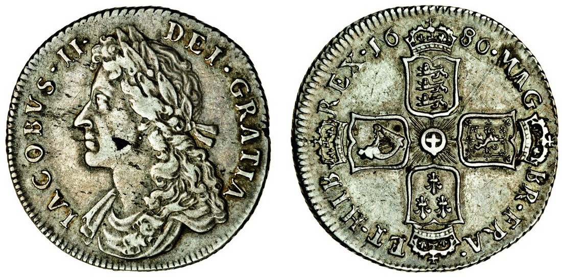 James II (1685-88), Shilling, 1686, laureate draped bust left, rev. four crowned shields cruciform (ESC 1070; S.3410), hay marking, flan flaw on cheek, scratch to reverse, very fine