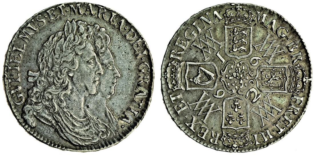 William and Mary (1688-94), Crown, 1692/inverted 2 qvinto, laureate conjoined busts right, rev. four crowned shields cruciform, monogram in angle (ESC 85; S.2433), even grey tone, very fine