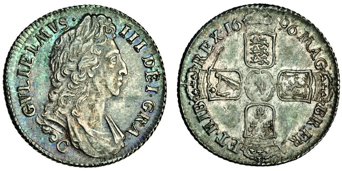 William III (1694-1702), Shilling, 1696, Chester, first laureate bust right, c below, r of gra over inverted a, rev. four crowned shields cruciform (ESC 1082A; S.3499), toned, extremely fine, rare