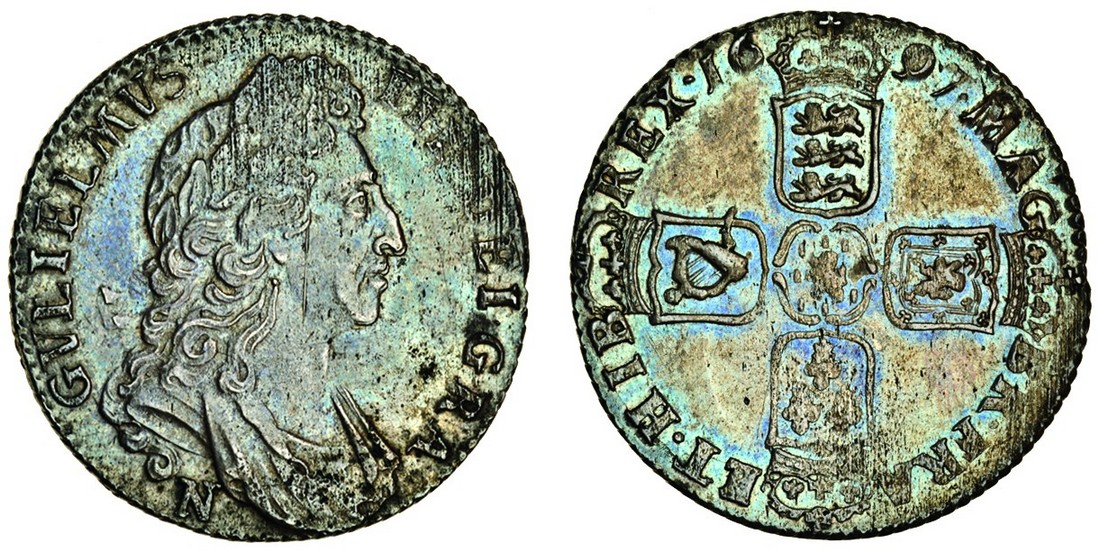 William III (1694-1702), Shilling, 1697, Norwich, first laureate bust right, n below, rev. four crowned shields cruciform (ESC 1099; S.3501), adjustment marks, toned, extremely fine