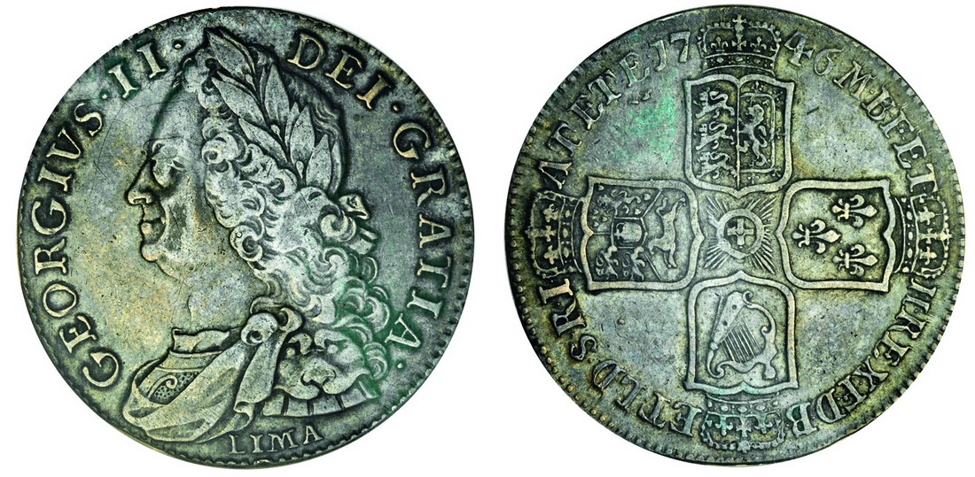 (x) George II (1727-60), Halfcrown, 1747, old laureate, draped and cuirassed bust left, lima below, rev. four crowned shields cruciform (ESC 606; S.3695A), in PCI holder graded EF40, very fine