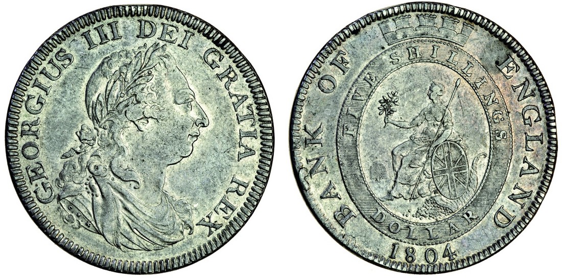 George III (1760-1820), emergency coinage, Bank of England issue, Dollar, 1804, laureate and cuirassed bust right, no stop after rex, rev. Britannia seated left within ribbon, crenellated crown above (ESC 164; S.3768), very fine