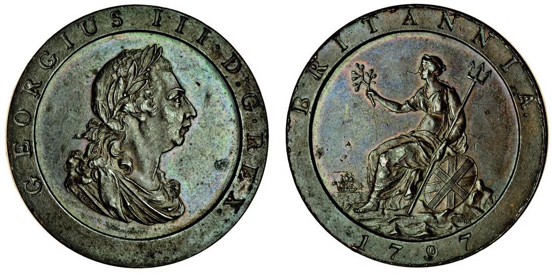George III (1760-1820), 'carthweel' Penny, 1797, laureate and draped bust right, eleven leaves in wreath, rev. Britannia (Peck 1133; S.3777), knock at 4 o'clock, carbon spot, light marks, extremely fine