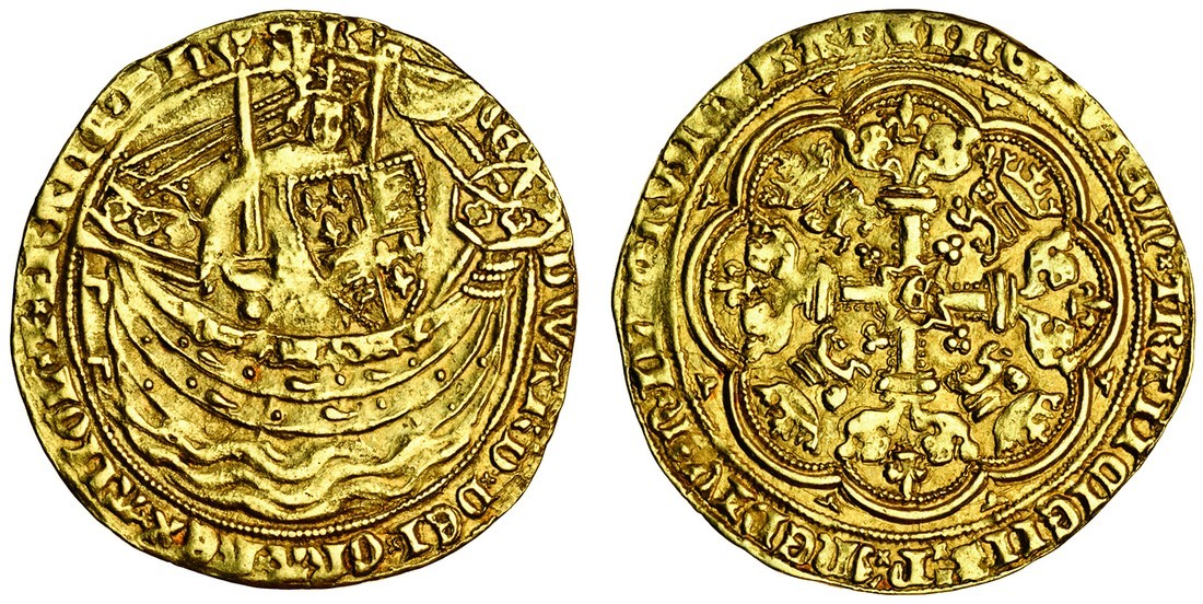 Edward III (1327-77), fourth coinage, pre-treaty period, 1351-61, Noble, 7.67g, London, serie G, m.m. cross 3, king crowned, standing facing in ship, holding sword and shield, franc, saltire stops, rev. floriate cross, arms extending from a central panel containing letter e, Lombardic m, saltire stops, pellet at each side of lis end of top limb (Schneider-; N.1182; S.1490), about very fine