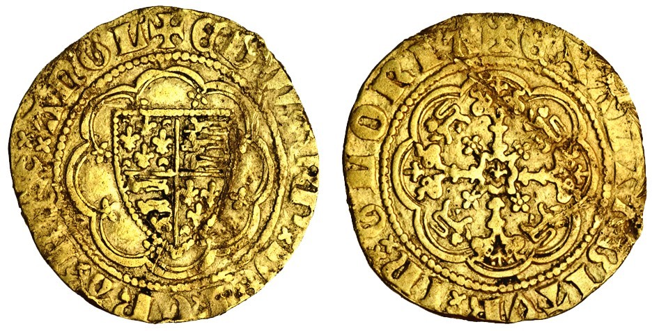 Edward III (1327-77), fourth coinage, treaty period, 1361-69, Quarter-Noble, 1.78g, m.m. cross potent, shield within tressure, rev. floriate cross, arms extending from central panel containing a lis (Schneider 81-2; N.1243; S.1510), straightened, fine