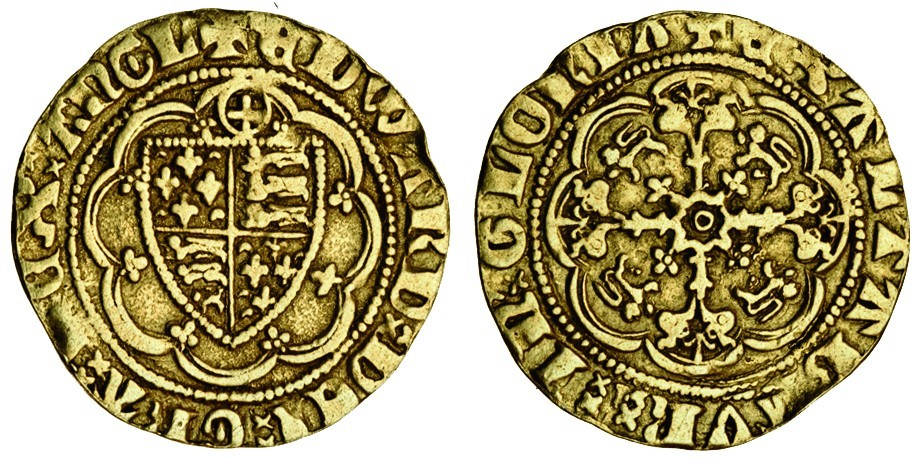 Edward III (1327-77), fourth coinage, treaty period, 1361-69, Quarter-Noble, 1.83g, shield within tressure, cross in circle above, French title omitted, pellet before edward, rev. floriate cross, arms extending from central panel containing an annulet (Schneider 100; Stewartby B2, p.258; N.1245; S.1513), very fine and an improvement on the Doubleday specimen, rare with the cross in circle on obverse