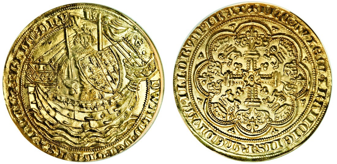Edward III (1327-77), fourth coinage, post treaty period, 1369-77, Noble, London, king crowned, standing facing in ship holding sword and shield, annulet before edward, rev.treaty period die, floriate cross, arms extending from central panel (N.1277; S.1516), in NGC holder graded MS63