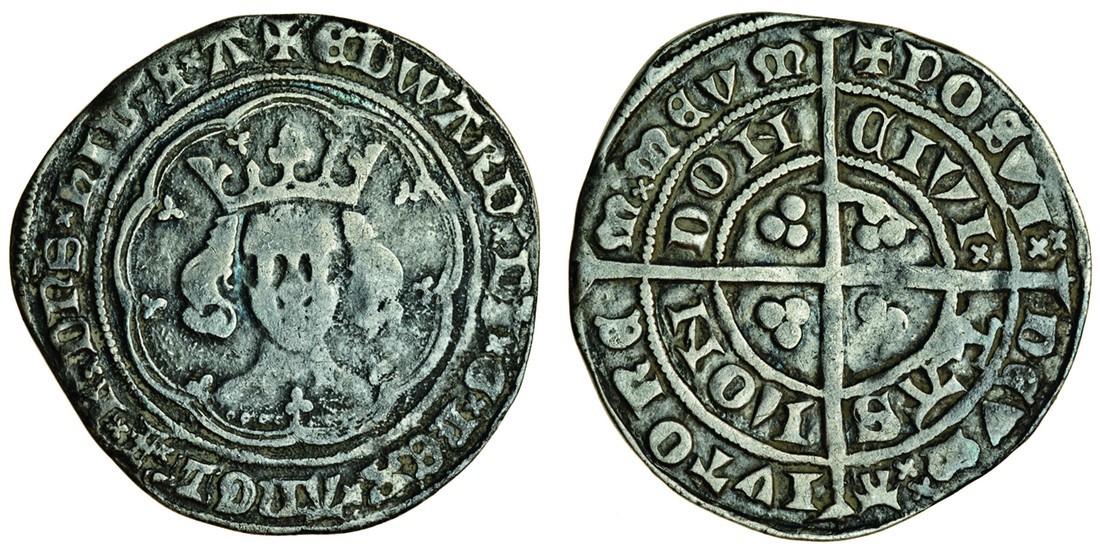 Edward III (1327-77), post-treaty period, 1369-77, Groat, 4.36g, London, m.m. cross pattée with four pellets (without pellets on reverse), single saltire punctuation, row of annulets under the bust ('chain mail'), fleurs on all cusps, hib f a, rev., single and double saltire punctuation (N.1284; S.1639), dark staining, bust weakness, on a good sized flan and centrally struck, nearly very fine, rare