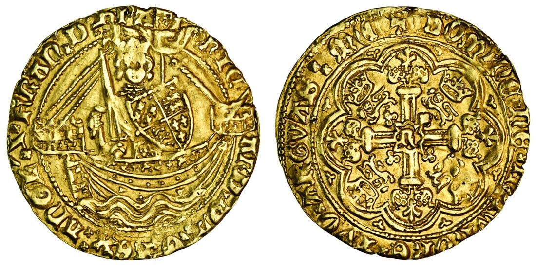 (x) Richard II (1377-99), Half-Noble, 3.79g. London, type IIIA, king standing facing in ship holding sword and shield, no marks, rev. floriated cross with lis at ends, R in centre, saltire stops, m.m. cross pattée on reverse only (N.1311; S.1667), lightly buckled, king's face somewhat weak, otherwise good very fine and with lustre, a very rare denomination for Richard II