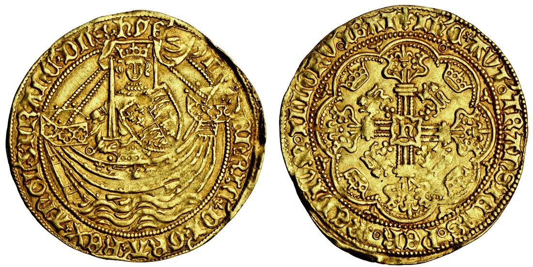 (x) Henry VI (first reign 1422-61), annulet issue, 1422-c.1430, Noble, 6.89g, London, king, crowned, standing facing in ship, holding sword and shield, lis after henric, trefoil stops, rev. floriate cross, arms extending from a central panel containing a letter h, crowned leopards in angles, mullet after ihc, annulet stops (Schneider 274-90; N.1414; S.1799), excess metal but still a full piece, a little weakness on ship and reverse devices, mostly well struck with the die sinkers' guides still visible on reverse, good very fine