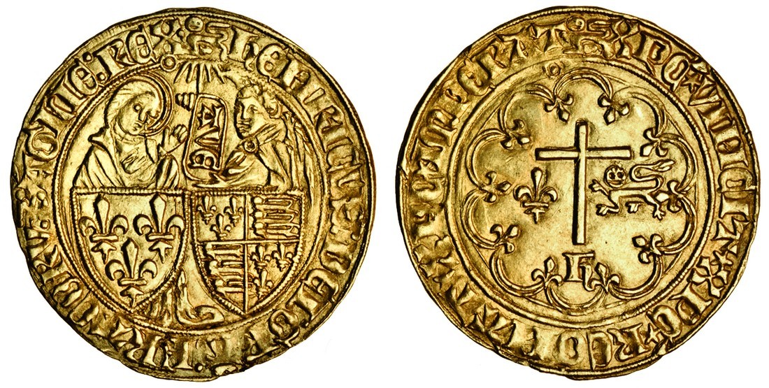 Anglo-Gallic, Henry VI (1422-53), Salut d'or, 3.45g, Rouen, m.m. leopard, shield of France, left, and England, right, Virgin Mary behind, left, angel Gabriel, right, between them a banner surmounted by sun rays, on which ave written downwards, double pellet stops, pellet in annulet on inner circle under last letter of legend, king's name spelt hehricvs, rev. Latin cross within tressure, h below, dividing lis and leopard, mullet stops, pellet in annulet on inner circle under last letter of legend (Schneider III, 111; Elias 270c; F.18), a fantastic strike with original mint lustre, nearly extremely fine
