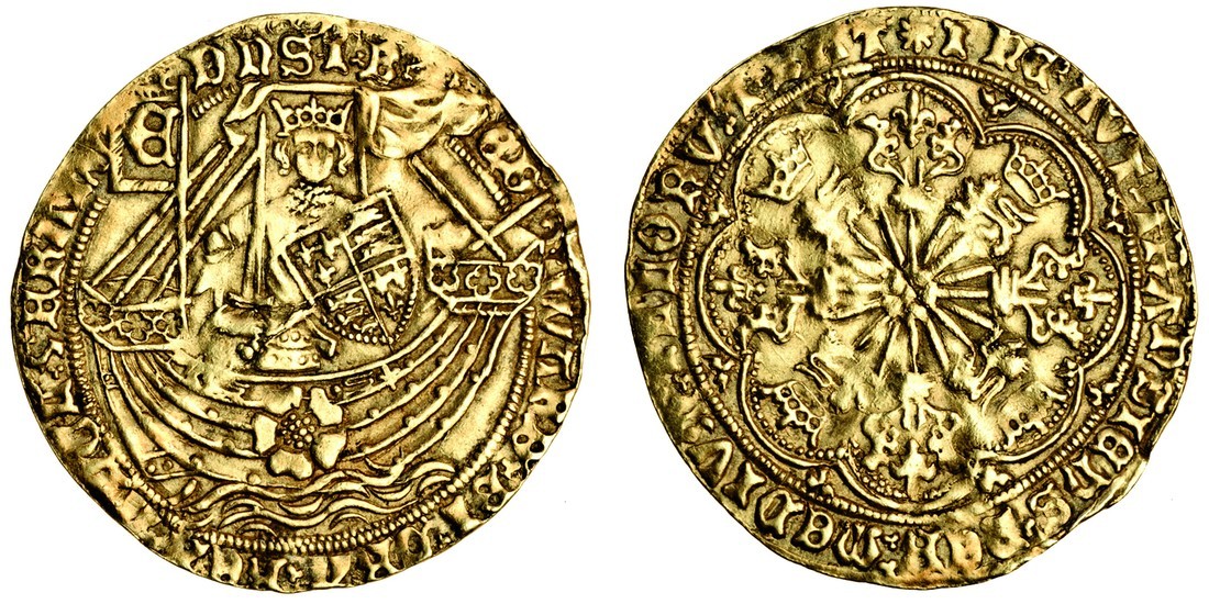 Edward IV (first reign 1461-70), light coinage, 1464-70, Ryal, 7.68g, London, m.m. sun, king, crowned, standing in ship holding sword and shield, flag with letter e at stern, rose on hull, rev. rose on radiant sun over floriate cross, crowned leopards in angles, large fleurs in spandrels (Schneider 355-57; N.1549; S.1950), flan crack at centre, very fine