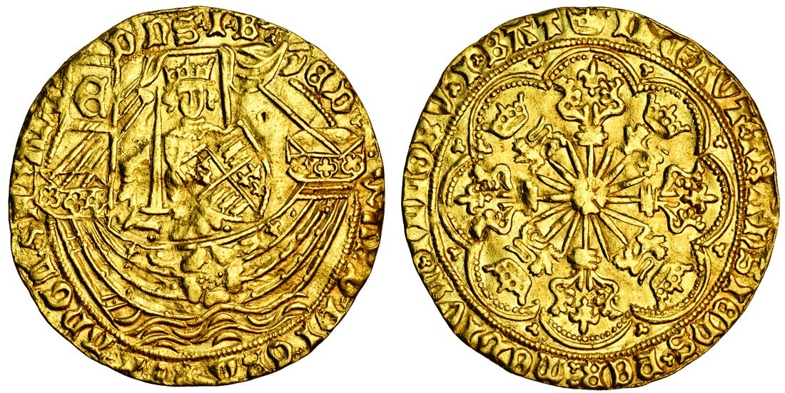 Edward IV (first reign 1461-70), light coinage, 1464-70, Ryal, 7.56g, London, m.m. crown, king crowned, standing facing in ship with sword and shield, flag at stern, rose on hull, rev. rose on radiant sun over floriate cross, crowned leopards in angles, trefoil in spandrels (Schneider 367; N.1549; S.1951), small dig to right of shield, about very fine