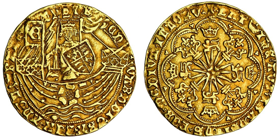 Edward IV (first reign 1461-70), light coinage, 1464-70, Ryal, 7.54g, London, m.m. crown, king crowned, standing facing in ship with sword and shield, flag at stern, rose on hull, rev. rose on radiant sun over floriate cross, crowned leopards in angles, trefoil in spandrels (Schneider 367; N.1549; S.1951), very fine